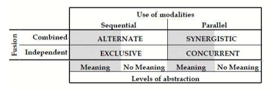 - Concurrency: different chunks of information are given several modalities at the same time, but they are not complementary, and so they don’t have to be merged. This allows a faster interaction since the modalities are simultaneous.
