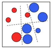 Let’s assume we have a two dimensional features. Each element could be in the blue or red class. We can see in the image how it couldn’t exist a line (weak classifier) that could perfectly divide blue dots from red dots.