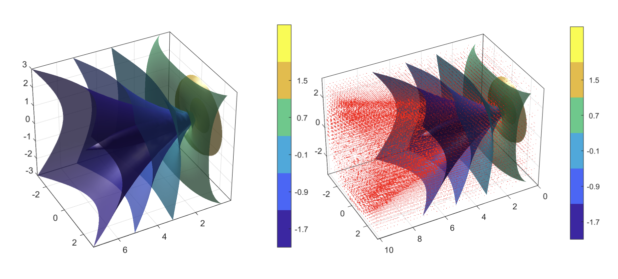 This representation is also valid for 3D functions, meaning . In this case the projection of the function will be a surface, and so they will be called iso-surfaces (or level surfaces).