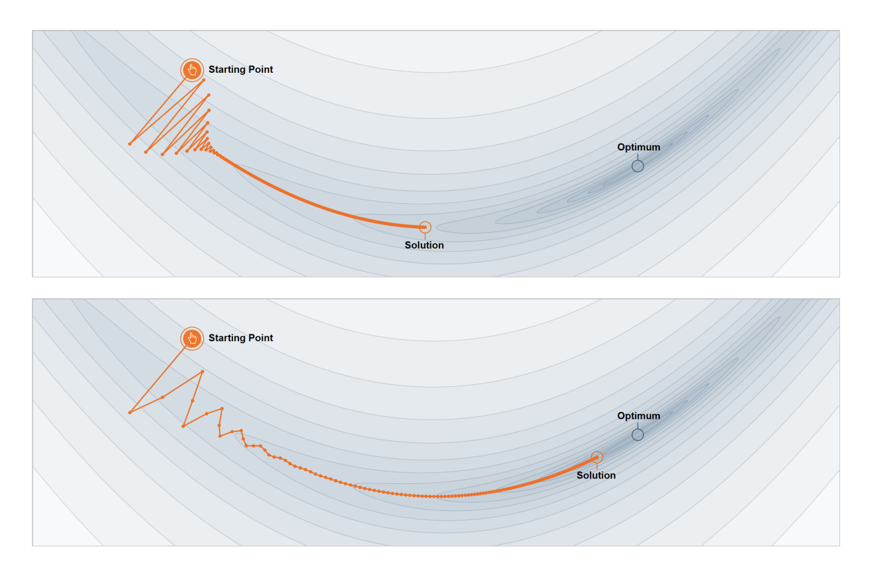 The step length would be maximized when the new gradient has the same orientation as the previous one. This means that the point will accelerate, differently from standard GD in which the “speed” of the descent is always the same.