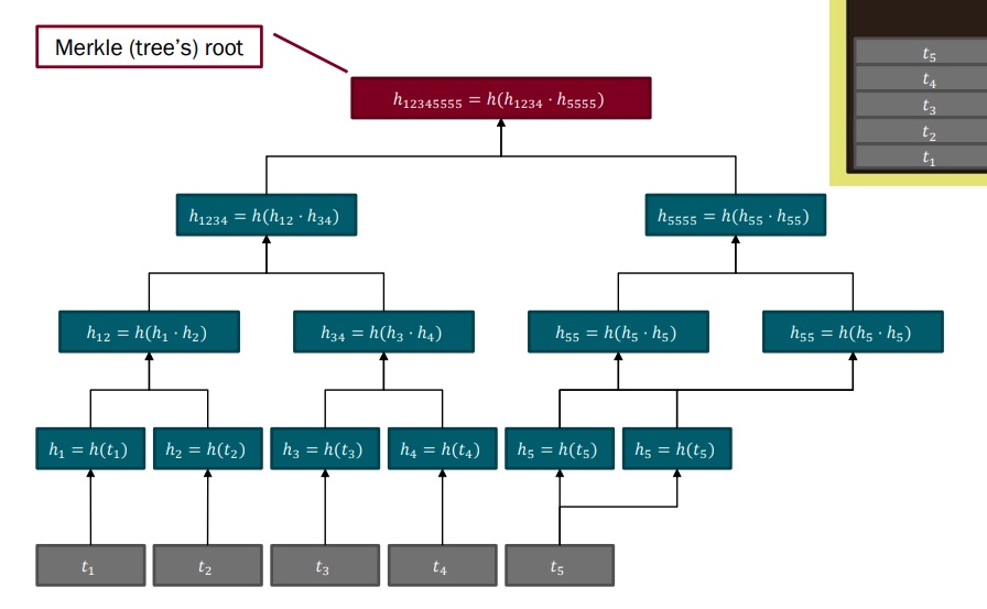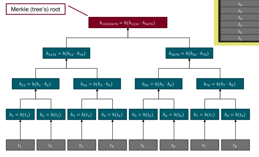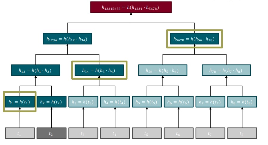Let’s now say that a light node wants to verify that is indeed in the block. The light node doesn’t need to ask a full archival node the hashes of all the single transaction, but it can compute from , and then it can ask for and in order to compute and then compute the Merkle root to verify if it’s the same as before.