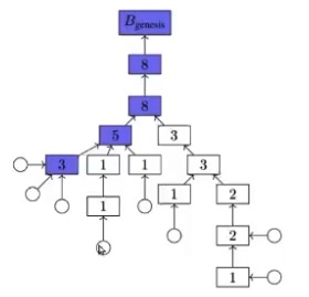 Without LMD-GHOST, the right most fork would be chosen. With LMD-GHOST, actually the fork with the highest weight is the leftmost, and so it will be chosen.